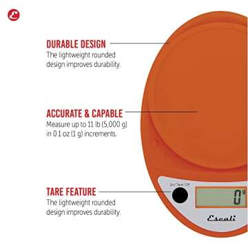 Escali Primo Digital Food Scale Multi-Functional Kitchen Scale and Baking Scale for Precise Weight Measuring and Portion Control, 8.5 x 6 x 1.5 inches, Pumpkin Orange