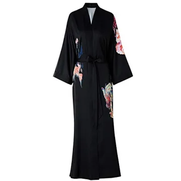 Escalier Women's Kimono Robe Long - Floral Printed Silk Bathrobe Nightgown Black-Phoenix