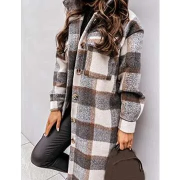 Esmeling Womens Plaid Shacket Brushed Flannel Shirt Jacket Mid Long Wool Blend Tartan Coat