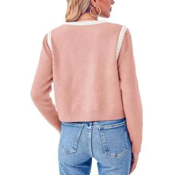 Esobo Womens Knit Cardigan Sweaters Open Front Long Sleeve Cropped Trendy Jacket Outerwear(White-Pink,Small)