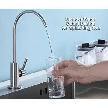 Show more Introducing the ESOW Kitchen Water Filter Faucet, the perfect blend of functionality and style. Constructed from premium metal and featuring a beautiful brushed nickel finish, this faucet is designed to enhance both the aesthetic appeal and functionality of your kitchen. Engineered with lead-free SUS304 stainless steel, it not only ensures durability but also promotes family health by offering clean, safe drinking water, especially for kids.