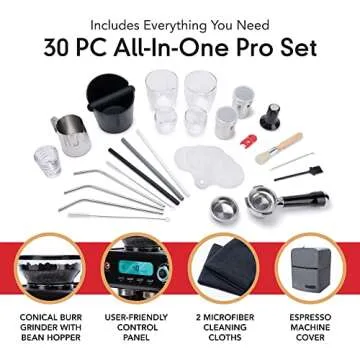 EspressoWorks Barista Pro Series Espresso Machine with Grinder, Steamer and LCD Display - Ready To Go In 60 Sec - 15-Bar Latte and Cappuccino Machine 30-Piece Bundle - Coffee Gifts (Black)