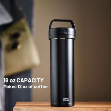 Show moreIntroducing the ESPRO P0 Ultralight French Press Coffee Maker, your new travel companion that ensures you never have to compromise on flavor while on the go. Crafted from vacuum insulated stainless steel, this innovative French press combines functionality with style in a sleek matte meteorite black finish. With its ultra-lightweight design, you can savor rich, aromatic coffee anywhere—be it on your daily commute, an exotic trip, or while camping under the stars. Experience brewing perfection in just a few simple steps.