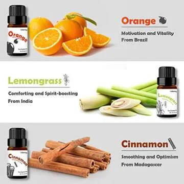 The aromatherapeutic properties of this set will transform your environment: let Tea Tree oil clear your mind; Lavender oil release your tension and promote restful sleep; Orange oil restore your energy with its uplifting scent; Peppermint oil refresh your senses; Cinnamon oil comfort your emotions; and Lemongrass oil reboot your vitality.
