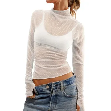 Show moreIntroducing the Essrite Women's 2024 Fall Outfit Mock Neck Mesh Sheer Swiss Dot Lace Laying Top – the epitome of chic fashion that seamlessly blends elegance with modernity. This stunning sheer mesh blouse is crafted from a premium blend of 85% Polyamide and 15% Elastane, ensuring a soft, breathable, and stretchy fit that gracefully hugs your silhouette. Featuring an exquisitely designed mock neck and long sleeves, this top offers a flattering structure while the dalmatian polka dot pattern lends an air of playful sophistication. Whether layered over a sleek cami or worn solo as a statement piece, this versatile garment is essential for the fashion-forward woman seeking to elevate her wardrobe.