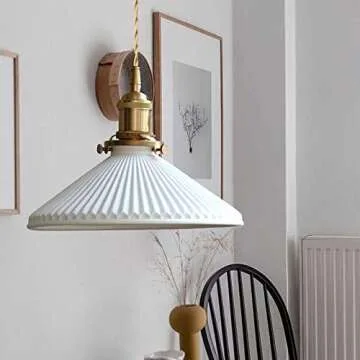 Show more Illuminate your space with the ESSZYIE E26 Modern Pendant Light, a perfect blend of simplicity and style that is set to transform any room effortlessly. This exquisite pendant fixture features a minimalist pleated ceramic design that adds a touch of elegance and sophistication, making it an ideal addition to kitchens, dining rooms, living rooms, and more. With dimensions of 8.85 inches in diameter and a height of 6.29 inches, this pendant light is compact yet capable of creating a significant ambiance in your environment. A key highlight of this design is its adjustability; equipped with a 59.05-inch long wire, you can customize the height of the light fixture to fit your unique lighting needs and desired aesthetic perfectly.