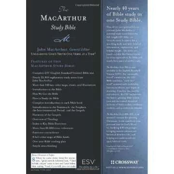When compared with other study Bibles, the ESV MacArthur Study Bible stands apart due to Dr. MacArthur's extensive scholarship and the insightful articulation of Reformed theology. Unlike many practice-oriented editions, it provides in-depth theological notes that offer historical context and doctrinal clarity. Competitors may offer varying teaching styles or formats, but for those committed to a Calvinistic viewpoint and who desire an honest presentation of Scripture, few can match the thoroughness and reliability of MacArthur's work.