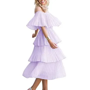 Show moreStep into summer elegance with the ETCYY Women's Off The Shoulder Ruffles Summer Wedding Guest Maxi Dress in Soft Purple. Crafted from a premium chiffon material, this stunning dress features a breathable and lightweight design that ensures comfort while you make memories. The off-the-shoulder silhouette highlights your shoulders and adds a flirty touch, while the ruffles at the neckline and pleated bodice create a billowy effect that captures the essence of warm-weather gatherings. With a flattering high waist and an elastic waistband, this dress is tailored to fit beautifully, falling gracefully to an above-feet length that is perfect for showing off your favorite summer sandals.