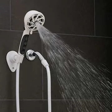 This shower head features five adjustable spray settings, rubber finger grips for safety, a flow control lever for pressure adjustments, and a 72-inch hose for extended reach.