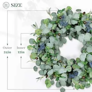 Show more This stunning 24-inch Eucalyptus Wreath transcends ordinary decor, bringing a refreshing touch of nature to your home. Crafted with care, this wreath features a mix of more than three types of eucalyptus leaves in varying shades, complemented by olive leaves and vibrant blue and white berries. Each piece is artfully arranged to ensure it looks lifelike all year round.