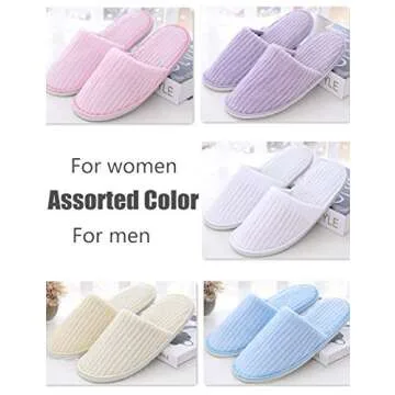 Show more Experience the ultimate in comfort with the Eucoz Spa Slippers package, offering 10 pairs of exquisitely crafted slippers designed for universal fit and versatility. Available in a delightful array of colors including White, Blue, Yellow, Pink, and Purple, these slippers are perfect for anyone seeking a stylish and hygienic footwear option. Each slipper measures 28.5cm x 11.5cm (approximately 11.5" x 4.5"), ensuring a comfortable fit for most. Additionally, we include a free storage bag to simplify organization and transport, making these slippers an ideal choice for the home and beyond.