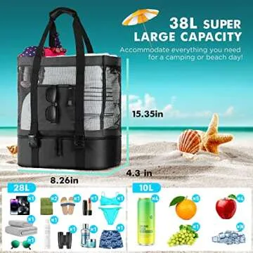 Show moreIntroducing the EUDELE Mesh Beach Tote Bag with Detachable Beach Cooler, your ultimate companion for all summer adventures! This innovative tote combines a spacious, sturdy mesh bag design with a cleverly integrated cooler. Crafted from high-quality PVC, the top half boasts superior wear and heat resistance, ensuring it can handle all your beach essentials. The insulated cooler compartment at the bottom keeps your drinks icy cold and is perfect for picnics, road trips, or beach days. With a maximum capacity of 38 liters and the ability to hold up to 150lbs, this tote is both strong and convenient for anyone on the go.