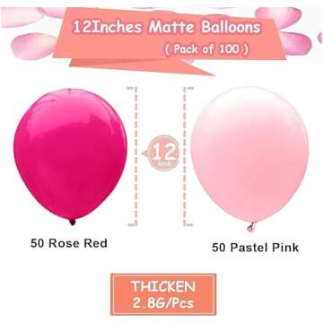 Show more Transform any gathering into a celebration with our stunning set of Pink Balloons. Designed with care, this set includes a total of 100 thickened 12-inch latex balloons in two delightful shades: 50 soft light pink and 50 lively hot pink. These colors are perfect for creating a festive atmosphere at a variety of events—from birthday parties to baby showers and everything in between. The balloons are versatile, promising to suit any occasion, whether it be a romantic wedding, a cheerful Valentine's Day celebration, or a heartfelt Mother's Day surprise.