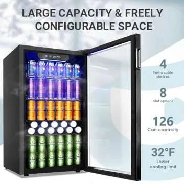 EUHOMY Beverage Refrigerator and Cooler, 126 Can Mini fridge with Glass Door, Small Refrigerator with Adjustable Shelves for Soda Beer or Wine, Home/Bar/Office, Black Steel