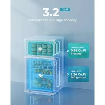 Show moreIntroducing the EUHOMY Mini Fridge with Freezer, a perfect blend of modern design and exceptional functionality for all your cooling needs. With a compact yet spacious capacity of 3.2 Cu.Ft, this versatile appliance holds everything from icy cold drinks to delightful frozen treats. The thoughtfully crafted layout features a 0.96 Cu.Ft freezer ideal for ice cream storage and a 2.24 Cu.Ft fridge compartment to keep your fruits, vegetables, and beverages refreshingly cool.