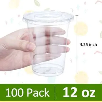 Eupako 12 oz Plastic Cups with Lids 100 Sets Clear Disposable Plastic Party Cups with Flat Lids to Go, Cold Drink Cups, Smoothie Cups, Milkshake Cups