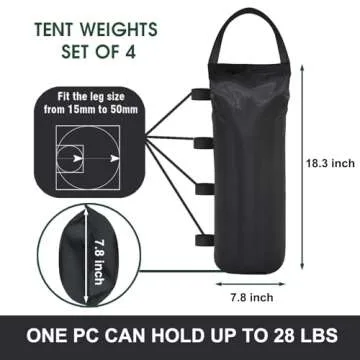 Designed with convenience in mind, each bag is incredibly easy to fill with sand or other weights, holding a maximum of **28 lbs** per bag. The integrated **Velcro straps** allow for hassle-free attachment and removal, enabling quick setups and takedowns. Plus, they are reusable, which means you can rely on them for future gatherings, ensuring you have a reliable weight solution time and time again.