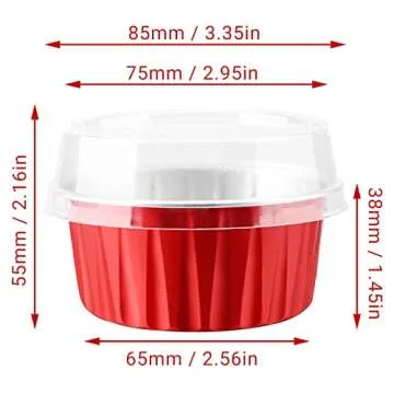 Show moreIntroducing the EUSOAR Disposable Ramekins with Lids, the ideal solution for all your baking and dessert needs. This set includes 30 pieces of high-quality 5oz aluminum foil cupcake baking cups, elegantly designed in a vibrant red color. Crafted from sturdy aluminum foil, these ramekins are not only durable but also offer exceptional heat conductivity, allowing for perfect baking without the need for additional trays or pans. Their oven-safe capacity of up to 220℃/428℉ ensures that your treats bake evenly and beautifully, making them a must-have for any baking enthusiast.