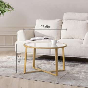 Show more Introducing the ideal accent piece for any modern living space, this Asymmetrical Gold Coffee Table effortlessly blends style and function. With a refined circular design and a sturdy structure, crafted with a solid 38mm wide leg and a 30mm inner frame, this coffee table offers unparalleled strength, supporting a maximum load capacity of 180 lbs. Perfectly sized at 27.6 inches in diameter and 17.7 inches in height, it is designed to fit seamlessly with your living room or office furniture.