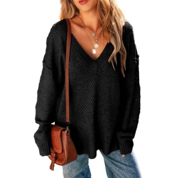 EVALESS Crochet Sweater for Women Fashion 2024 Hollow Out Ribbed Knit Tops Casual Long Sleeve V Neck Sweaters Pullover Jumper Outfits Black 1X