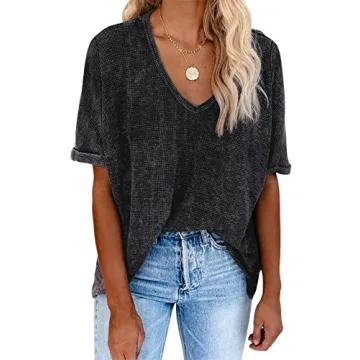 Show more The EVALESS V Neck Tops for Women is the perfect blend of comfort, style, and versatility for the summer of 2024. Made with a premium waffle knit cotton fabric, this oversized tee is designed to keep you feeling fresh and chic all season long. Available in a spectrum of vibrant solid colors, it offers a trendy v-neckline and short sleeves, making it an essential addition to your warm-weather wardrobe. If you prefer a more fitted appearance, we recommend sizing down, as its loose fit design beautifully conceals the abdomen for a flattering silhouette.