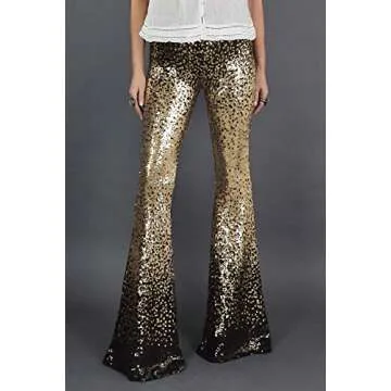 Show more Elevate your wardrobe with the stunning EVALESS Women’s Glitter Gradient Sequin Pants, designed to ensure you stand out in every crowd. Crafted with meticulous attention to detail, these high-waisted wide-leg flare trousers are adorned with luminous tonal sequins, enhancing their vibrant appearance while providing that perfect glimmer under any light. The luxurious lining balances the dazzling exterior, making them as comfortable as they are eye-catching—ideal for both special occasions and everyday wear.