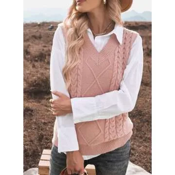 EVALESS Womens Pink Sweater Vest V Neck Sleeveless Sweaters for Women Cable Knit Solid Color Tops Loose Casual Soft Sweater Small