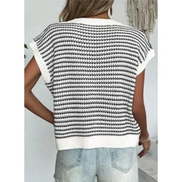 Show moreIntroducing the EVALESS Women's Spring Striped Sweater Vest, the ultimate blend of breathable comfort and timeless style that will quickly become a staple in your wardrobe. With its featherweight knit fabric, this vest sweater promises supreme comfort and breathability, making it an ideal choice for those warm days and cool evenings. The elegant design features a crewneck and cap sleeves, adorned with classic stripes in chic black and white, effortlessly harmonizing with any outfit you choose. Whether layered over a delicate high-waisted skirt or paired with your favorite jeans, this versatile top enhances your natural beauty while allowing for easy movement.