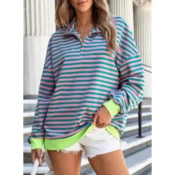 EVALESS Womens Sweatshirt 2024 Fall Outfits for Women Oversized Striped Long Sleeve Shirts Cute Comfort Color Sweatshirts Fashion Loose Quarter Zip Pullover Tops Rose Pink Puff Hoodless Hoodie Medium