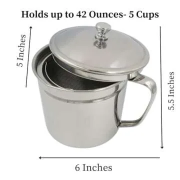 Show more Introducing the Evelots Cooking Oil Storage Can, a vital accessory for every kitchen enthusiast. Say goodbye to waste and hello to flavor with our large capacity bacon grease saver, designed to strain and store up to 5 cups (1.25 quarts or 42 fl. oz.) of your favorite cooking oils! Crafted with high-quality, food-grade stainless steel, this grease keeper not only looks great on your countertop but is also functional and easy to clean. With an included fine mesh strainer basket, comfy grip handle, and a convenient pour spot, transferring and storing oil has never been easier. Whether you’re saving bacon drippings or oil from your favorite frying adventures, our innovative design protects your stored oils from dust and food particles, ensuring they remain fresh for your next culinary creation.