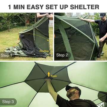 The tent is designed for quick setup, allowing you to pop it up in under a minute without any assembly required.