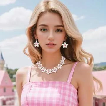 EVER FAITH Flower Jewelry Sets for Women, Dainty White Pink Enamel Faux Pearl Bead Wedding Party Choker Necklace Hook Earrings Set Summer Beach Accessories for Women