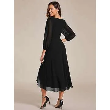 Show moreIntroducing the Ever-Pretty Women's Chiffon V Neck Long Sleeves Pleated A-Line Midi Length Wedding Guest Dress, a stunning addition to your wardrobe designed for glamour and elegance at any occasion. Crafted from lightweight chiffon, this dress offers a soft, flowing feel perfect for a variety of events. The eye-catching black color provides the versatility you need, whether for dining out or attending a wedding as a distinguished guest. With a flattering A-line silhouette, long sleeves, and an asymmetrical hem, this dress ensures that you not only feel beautiful but also look exceptional. Its V-neck design accentuates your neckline, adding a touch of allure that’s perfect for formal settings.