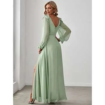 Show more This stunning formal dress from Ever-Pretty is the epitome of elegance and sophistication, designed specifically with the mother of the bride in mind. The A-line silhouette gracefully flows to the floor, accentuating your figure and ensuring you look your best during this special occasion. Crafted from premium chiffon, the fabric is both luxurious and comfortable, allowing for ease of movement throughout the day. The dress features open lantern sleeves that add a distinctive touch of drama, making it perfect for celebratory events. With its v-neckline and side slit, this dress radiates a modern charm, ensuring you remain the center of attention.