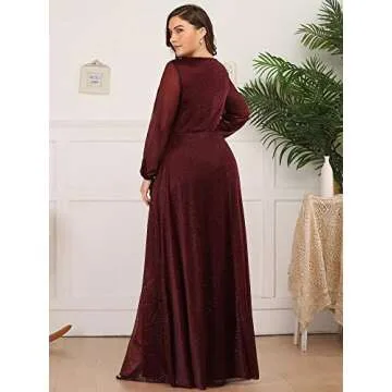Show moreIntroducing the stunning Ever-Pretty Women's Glitter A Line High Slit V-Neck Plus Size Formal Gown in a rich burgundy, designed to celebrate curves and enhance your natural beauty. This dress is not merely an outfit; it’s a source of confidence and elegance for any special occasion. Featuring a dramatic deep V-neck that beautifully frames the neckline, complemented by long sleeves, this gown effortlessly combines sophistication with a touch of allure. The eye-catching leg slit melds boldness with grace, ensuring you feel like royalty while making a memorable statement at formal events.
