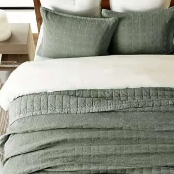 Show moreElevate your bedroom sanctuary with the EVERGRACEHOME Stonewashed Cotton Quilt Set. Designed for those who appreciate the finer things in life, this ultra-soft oversized bedspread coverlet set boasts a timeless olive green hue, perfectly blending classic sophistication with modern comfort. The intricate box stitching, combined with a unique crinkle texture, transforms your sleeping space into a realm of elegance and luxury. Crafted from breathable, lightweight cotton, this quilt set promises not only to adorn your decor but also to provide an inviting retreat season after season.