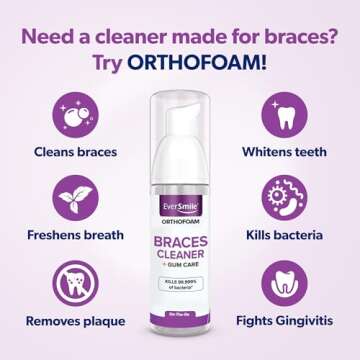 Show more Experience the ultimate oral hygiene solution tailored specifically for users with braces! The Original Brushable Braces Cleaner by EverSmile brings innovation to your daily brushing routine, enabling you to achieve a thorough clean like never before. Specially designed with a unique foaming formula, OrthoFoam effortlessly reaches every groove between your braces and teeth, eliminating food particles, acids, and plaque biofilm that might lead to dental issues such as gingivitis and periodontitis.