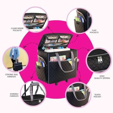 Everything Mary Sewing Machine Rolling Carrying Case, Black Quilted - Trolley Bag with Wheels for Brother, Bernina, Singer & Most Machines - Wheeled Tote Carrier for Notions & Crafts
