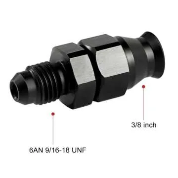 Show moreIntroducing the EVIL ENERGY 6AN Male to 3/8" Hardline Compression Fitting Adapter, a high-performance essential for automotive enthusiasts and professionals alike. This adapter is expertly crafted from high-quality aluminum alloy, promising not only durability and strength but also lightweight performance ideal for automotive and motorsports applications. The sleek black anodized finish further enhances its aesthetic appeal, making it the perfect addition to any performance vehicle’s fuel system. Designed specifically to seamlessly connect a 6AN male fitting (which has a standard thread size of 9/16 UNF) to a 3/8" OD hardline, this fitting ensures a secure and leak-free connection for all your fuel delivery and engine modification needs.