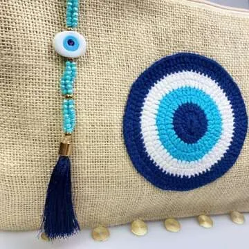 Evil Eye Clutch Bag Eco Friendly Jute Handheld Purse Large Space Zipper Closure Wipeable Liner Crystal Decoration