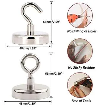 EVISWIY Strong Fishing Magnets Neodymium Rare Earth 180 LBS for Treasure Hunting Retrieving Salvage with 2 PCS Cup Hooks Dia. 48MM 1.89" Heavy Duty Magnetic Hooks for Hanging