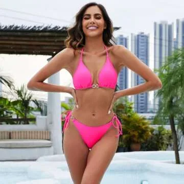 This bikini's adjustable neck and back straps ensure a personalized fit, allowing you to feel ultra-fashionable and sexy at the beach or poolside. The cheeky string thong bottoms lend an alluring twist, featuring adjustable straps and Brazilian tie sides, creating a stunning silhouette that turns heads. Adorned with small ring metal accessories, this bikini not only hugs your curves but elevates your beachwear style with a touch of chic.