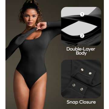 Ewedoos Long Sleeve Bodysuits for Women Scoop Neck Body Suits for Womens Tummy Control Soft Double Lined Bodysuit Tops