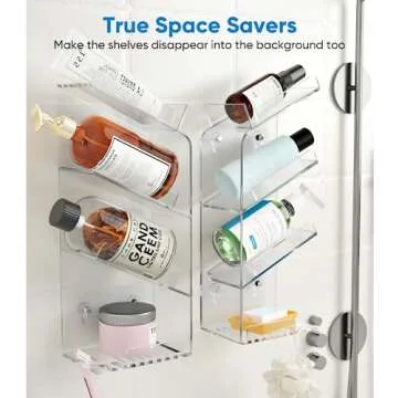 Show moreTransform your bathroom experience with the Ewinvos Acrylic Shower Caddy Shelves. This innovative and stylish shower rack combines functionality with modern design. Crafted from 100% premium acrylic, these clear shelves blend seamlessly into any decor, giving your bathroom a sleek, airy aesthetic. The slanted design of the shelves allows easy access to your shampoo, conditioner, and other shower essentials, ensuring that each item is readily available when you need it. Plus, with no drilling required for installation—thanks to the powerful adhesive tapes—these shelves can hold up to a remarkable 40 pounds, making them both practical and robust.