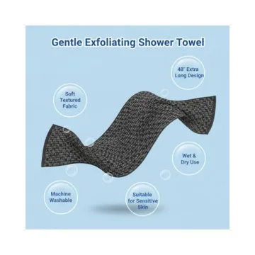 Show more Transform your shower routine with the ultimate luxury experience! The Exfoliating Shower Towel is not just an ordinary bath accessory; it’s a game changer for your skin health. Designed with your comfort in mind, this 48-inch long scrub washcloth makes reaching your back for a thorough clean effortless. Tailored for sensitive skin, it offers a delicate yet effective exfoliation, allowing you to feel rejuvenated and refreshed with every use. This chic black towel is perfect for both men and women, delivering a spa-like experience right in your bathroom.