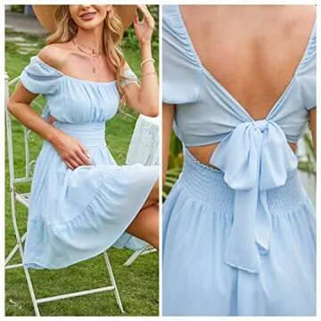Show more This enchanting fairy dress is the epitome of style and comfort, designed for the modern woman who appreciates elegance in her wardrobe. Crafted from a lightweight and flowy fabric, this dress ensures you feel comfortable while looking fabulous. The flattering cut accentuates your body curves, while the smocked waist cleverly conceals any tummy concerns. Its unique tie back design features an adjustable self-tie bowknot, adding a charming touch that enhances your silhouette.