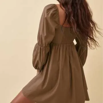 EXLURA Womens Square Neck Dress Long Puff Sleeve A-Line Casual Short Mini Dress Brown
