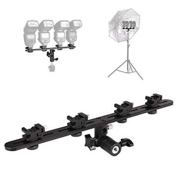 Show moreIntroducing the EXMAX E4 Camera Flash Speedlite Mount - a versatile and sturdy flash light stand bracket designed specifically for photographers and videographers who need to enhance their shooting capabilities. This innovative mount offers a unique FOUR FLASH HOT SHOE DESIGN, allowing you to connect up to four flash units simultaneously. The special hot shoe clip is designed to fit virtually all camera flashes and LED lights, making it a must-have tool for anyone looking to elevate their lighting setup. Whether you're capturing high-action moments or detailed portraits, this bracket ensures you will get the perfect shot every time.