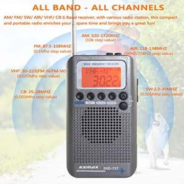 Show more Introducing the EXD-737 Full Band Hand Held Radio Receiver, the ultimate device for audio enthusiasts and those seeking reliable communication on the go. This versatile radio offers access to a wide array of bands, including FM (87.5-108MHz), AM (520-1720KHz), SW shortwave (2.3-30MHz), AIR aviation (118-138MHz), CB city band (25-28MHz), and VHF civil (30-223MHz). With its ability to capture signals from coast, train, racing, and even weather channels, this radio turns exploration into an adventure.