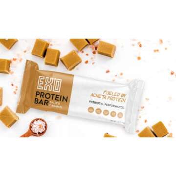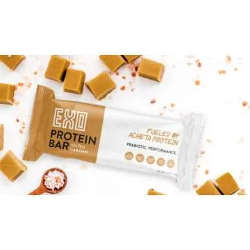 EXO Prebiotic Protein Bars, Salted Caramel | Dairy Free, Gluten Free, Low Sugar | 14g Protein, Sustainable, B12, Gut Heath, | Non-GMO. Vegetarian, Paleo | Vitamins, Sustained Energy, 12 Count,